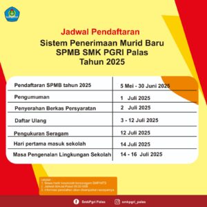Palas, 25 Juni 2025 – SMK PGRI Palas telah mengumumkan secara resmi jadwal dan persyaratan penting untuk penyerahan berkas calon siswa baru dalam Sistem Penerimaan Murid Baru (SPMB) tahun ajaran 2025/2026. Pengumuman ini dirilis melalui kanal media sosial sekolah untuk memastikan informasi tersebar luas kepada masyarakat, khususnya para lulusan SMP/MTs yang ingin melanjutkan pendidikan di SMK PGRI Palas.