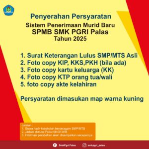 Manajemen SMK PGRI Palas mengimbau seluruh calon siswa baru dan orang tua/wali untuk mencermati informasi ini dengan saksama dan mempersiapkan semua dokumen yang diperlukan jauh-jauh hari agar proses penyerahan berkas berjalan tertib dan lancar.